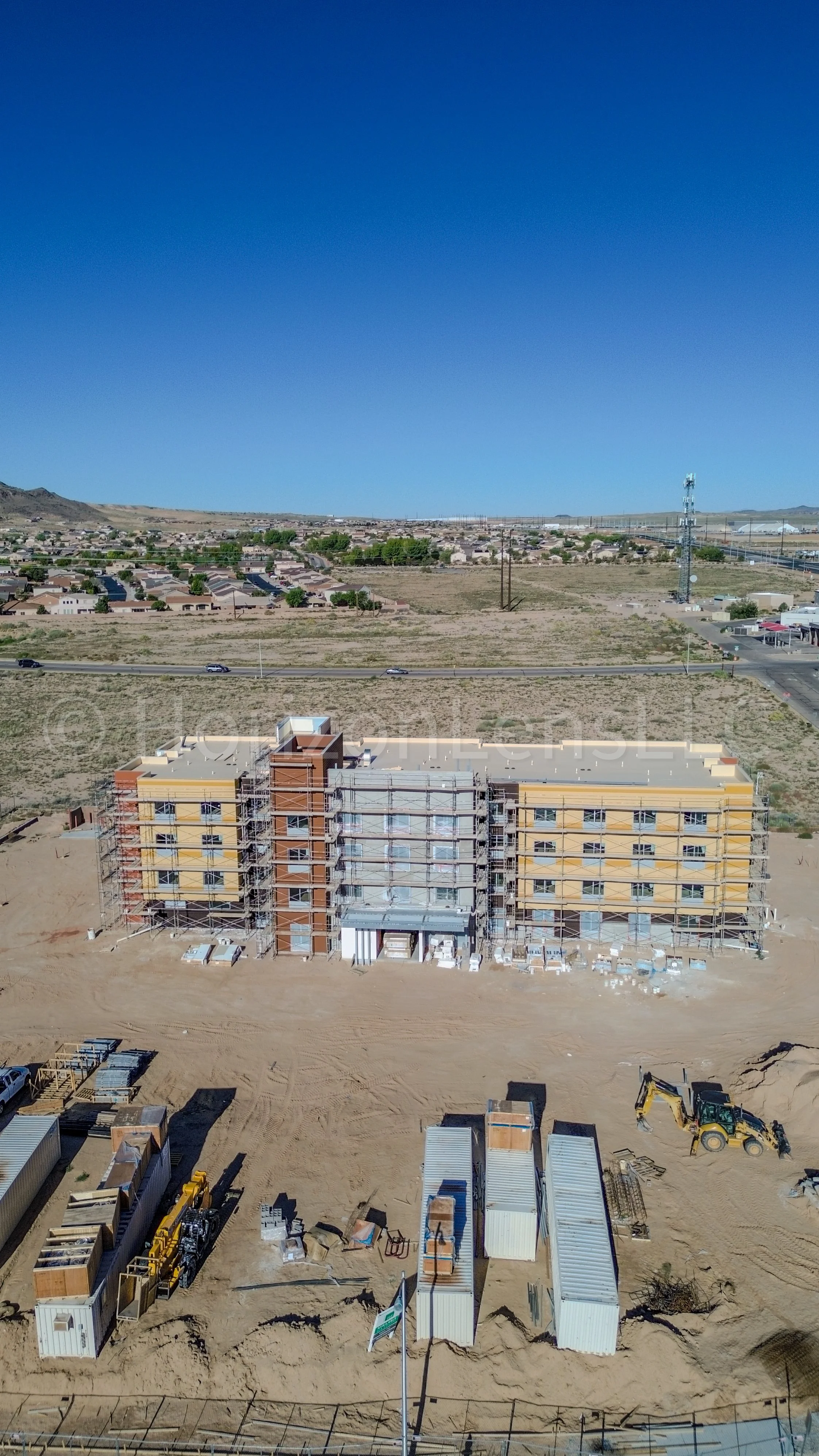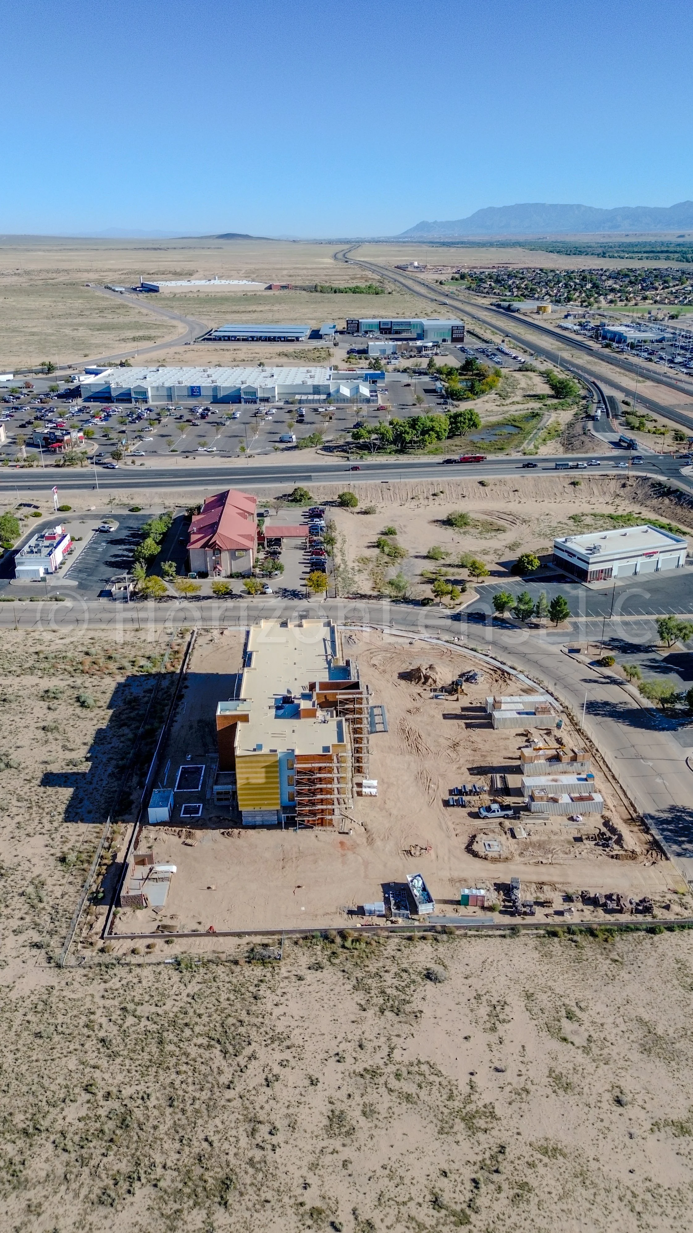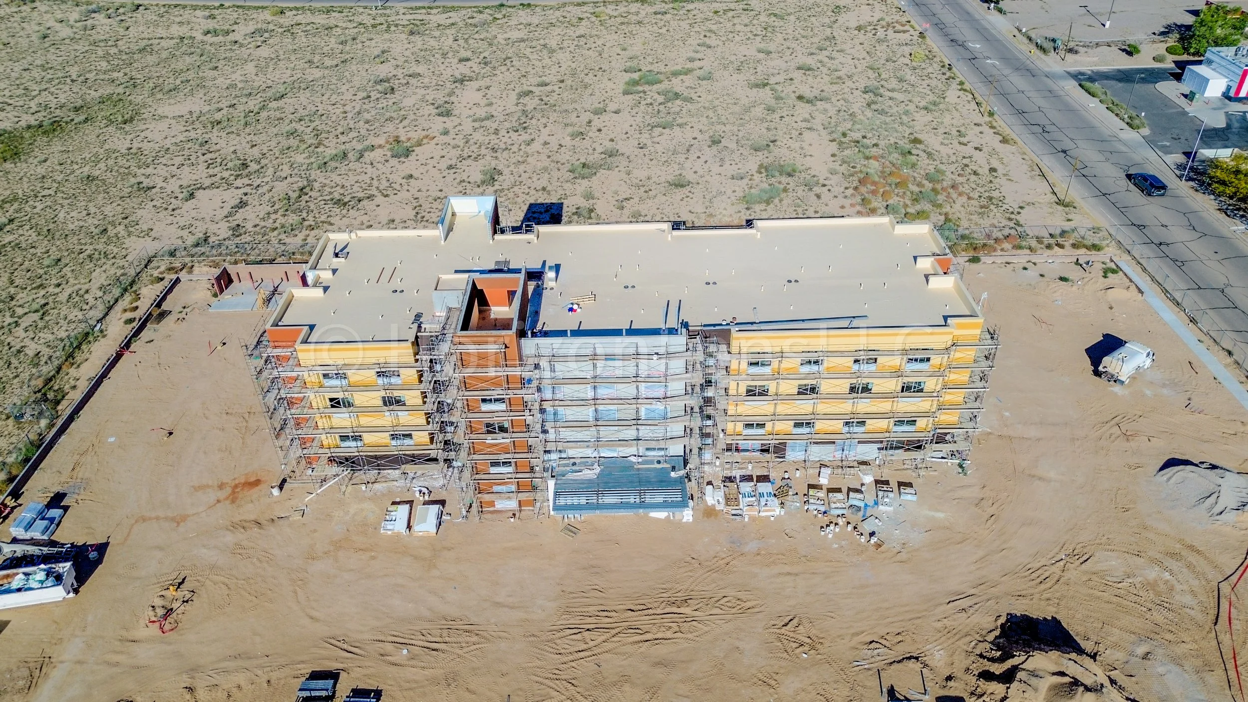 Drone top-down view of the new apartment building under construction in Los Lunas, revealing the roof structure, layout, and surrounding work zone from above.