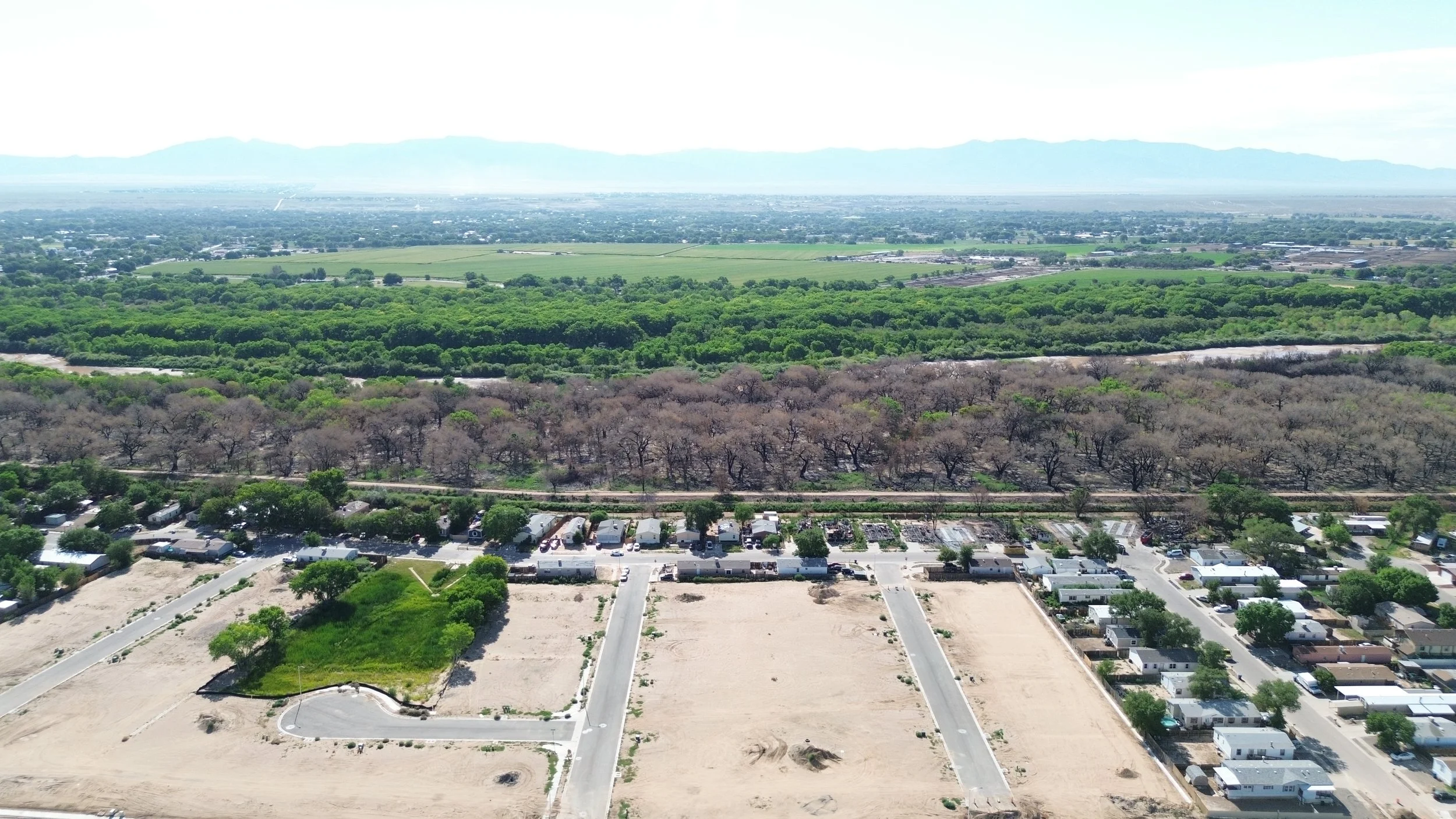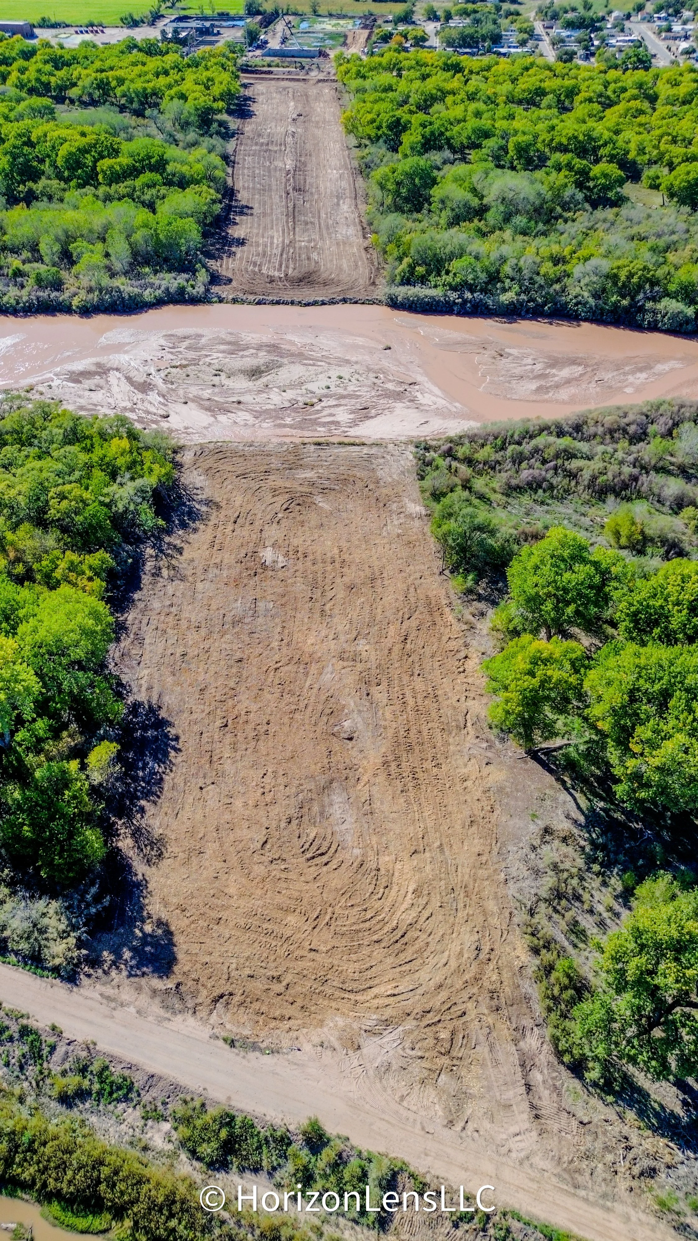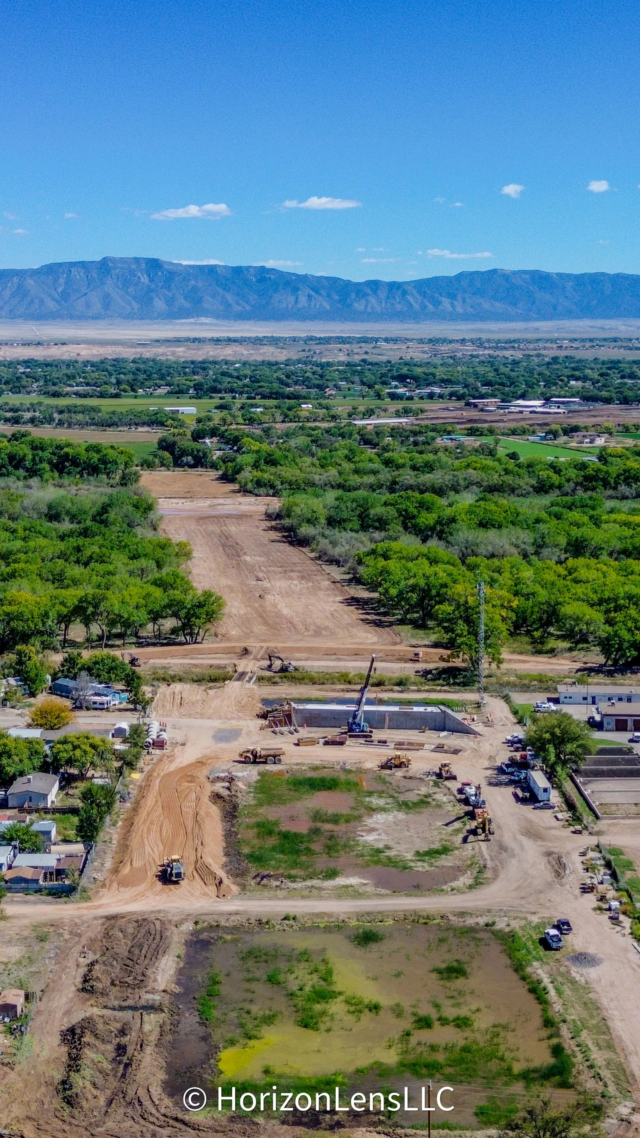 The photo captures progress on the new bridge and highway being built over the Rio Grande in Los Lunas. Heavy machinery and support structures line the river, with the emerging roadway illustrating the scale and importance of the project for the area’s transportation network.
