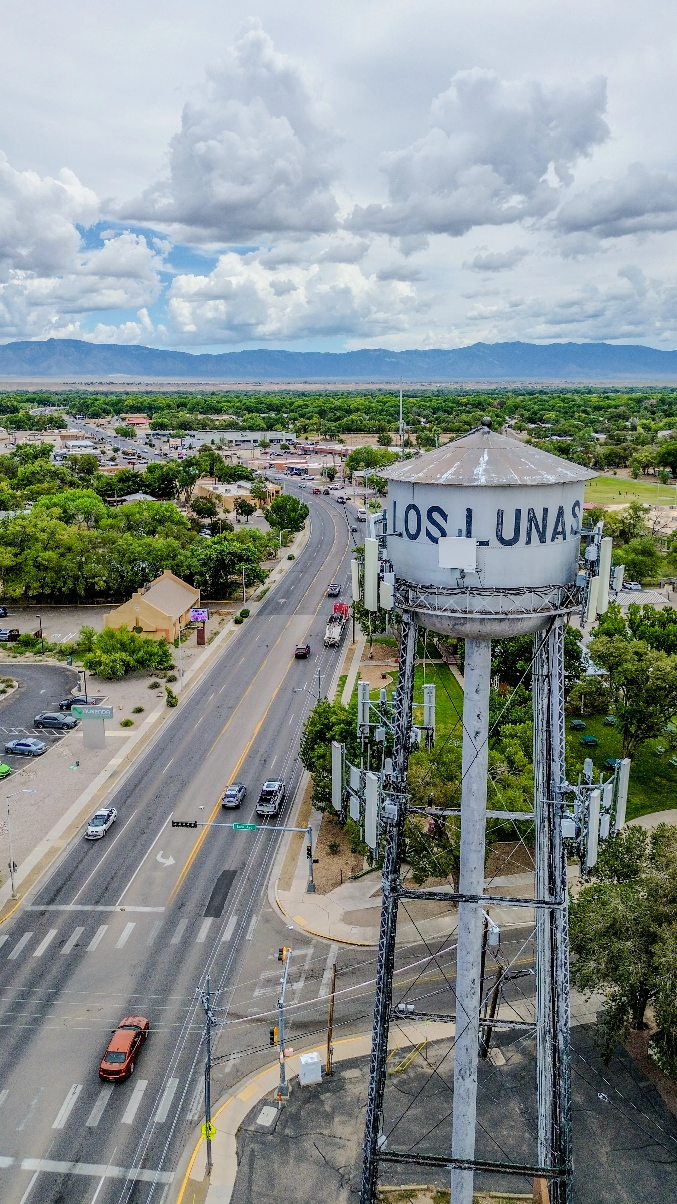 The image features the Los Lunas water tower standing prominently against the New Mexico sky. Its white structure with bold lettering marks the town’s identity, with surrounding landscape elements providing context to its location.
