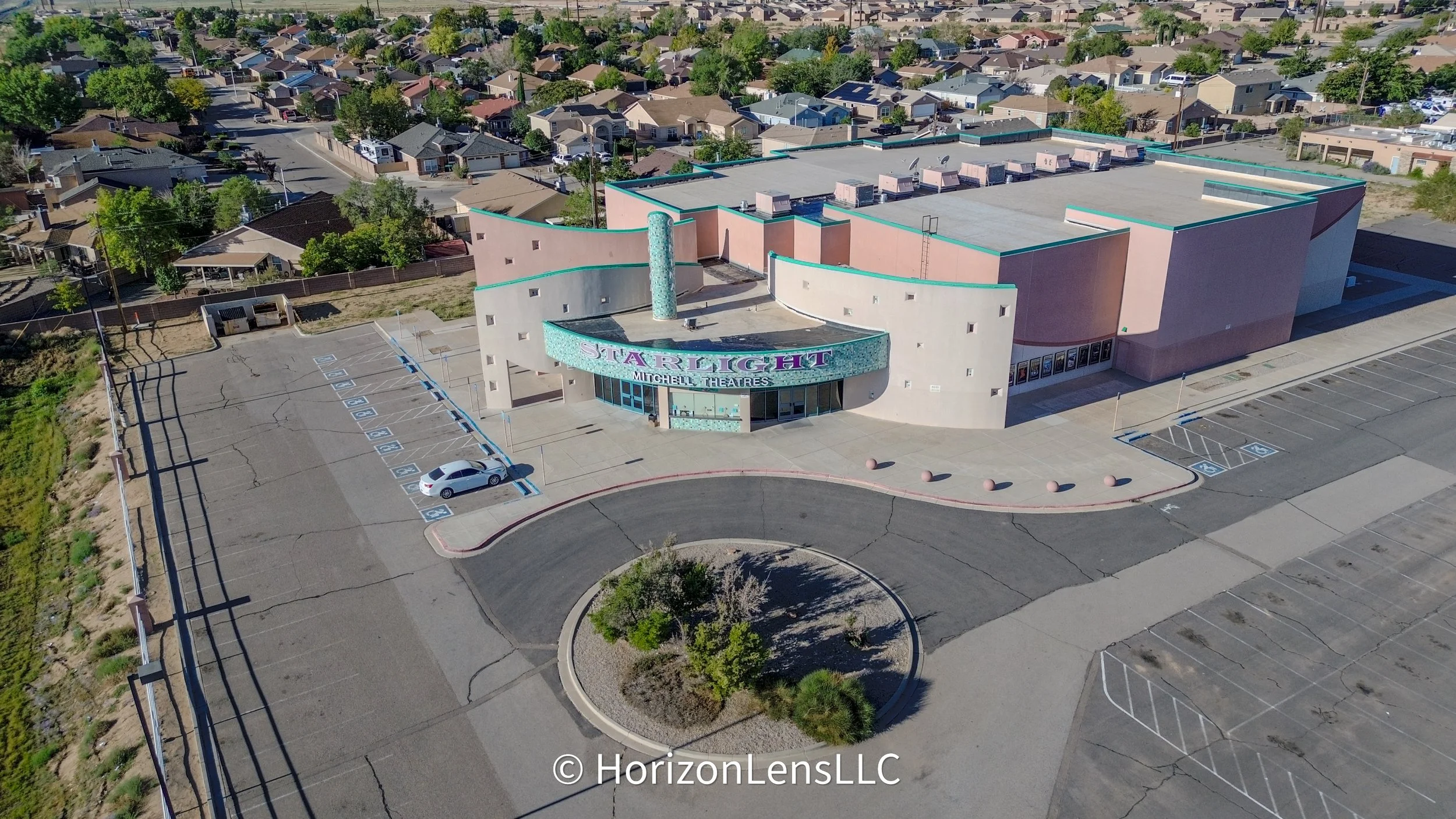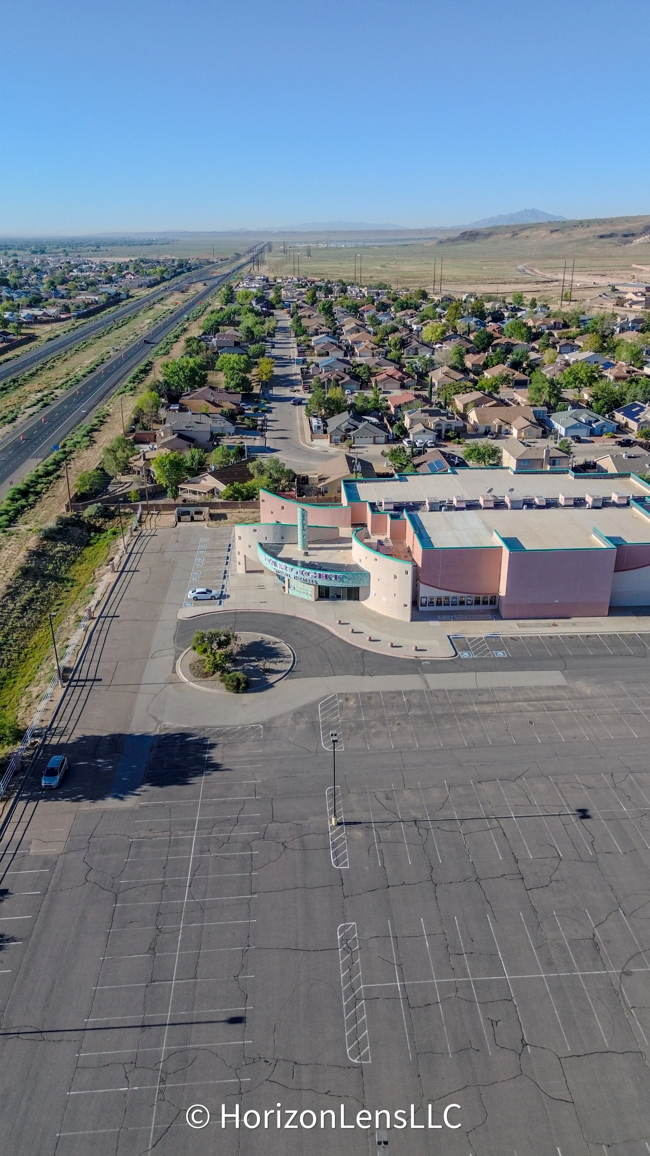 The aerial photo captures Starlight Cinema 8 in Los Lunas from above, showing the full outline of the theater building and its parking lot. Cars are visible in the surrounding area, and the shot highlights the cinema’s placement within the town, with nearby streets and desert landscape stretching into the distance.