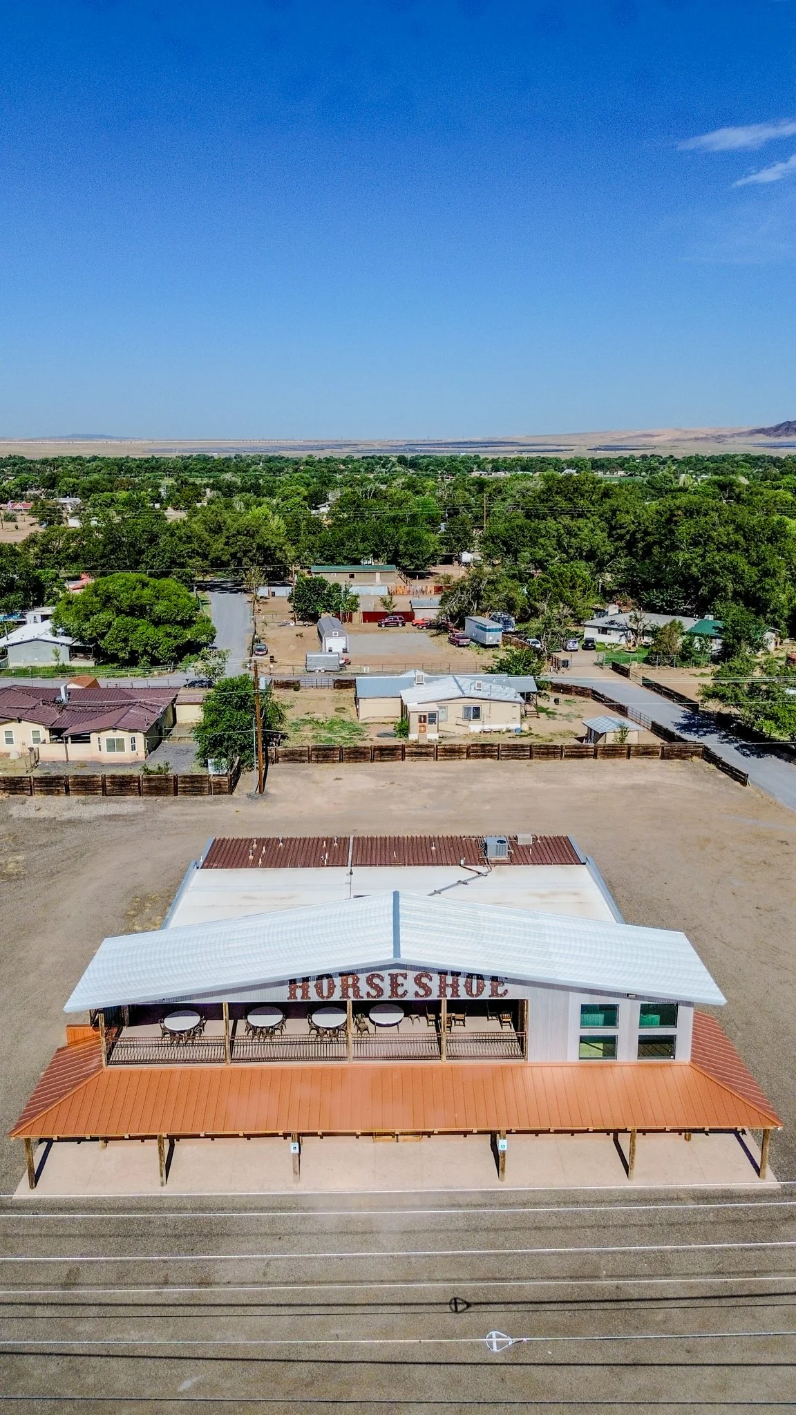 The photo presents an elevated front-facing view of the Horseshoe in Los Lunas. From above, the curved outline of the structure is clearly visible, emphasizing its distinctive horseshoe shape. The surrounding terrain and open sky provide additional context to the landmark’s setting.
