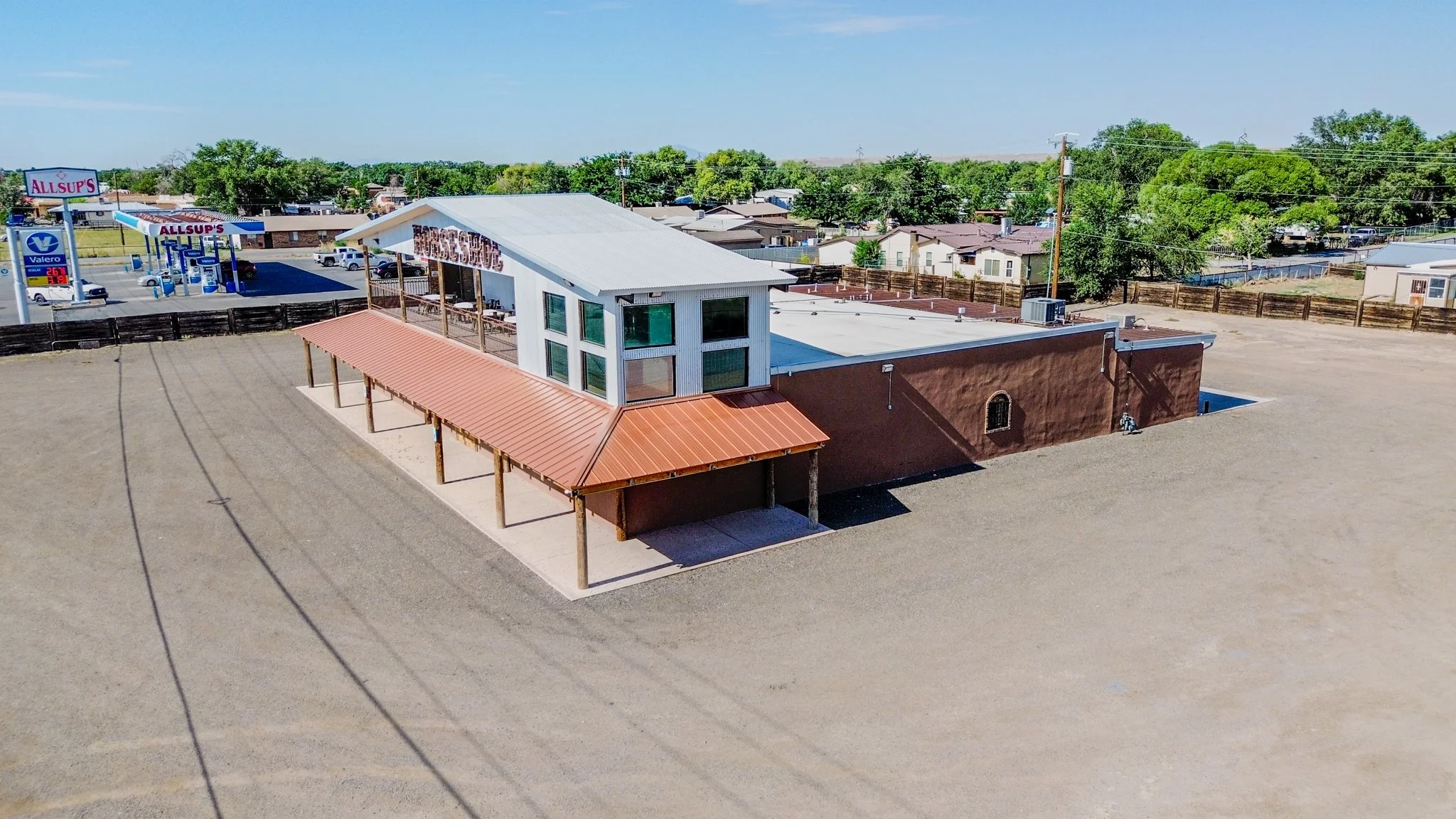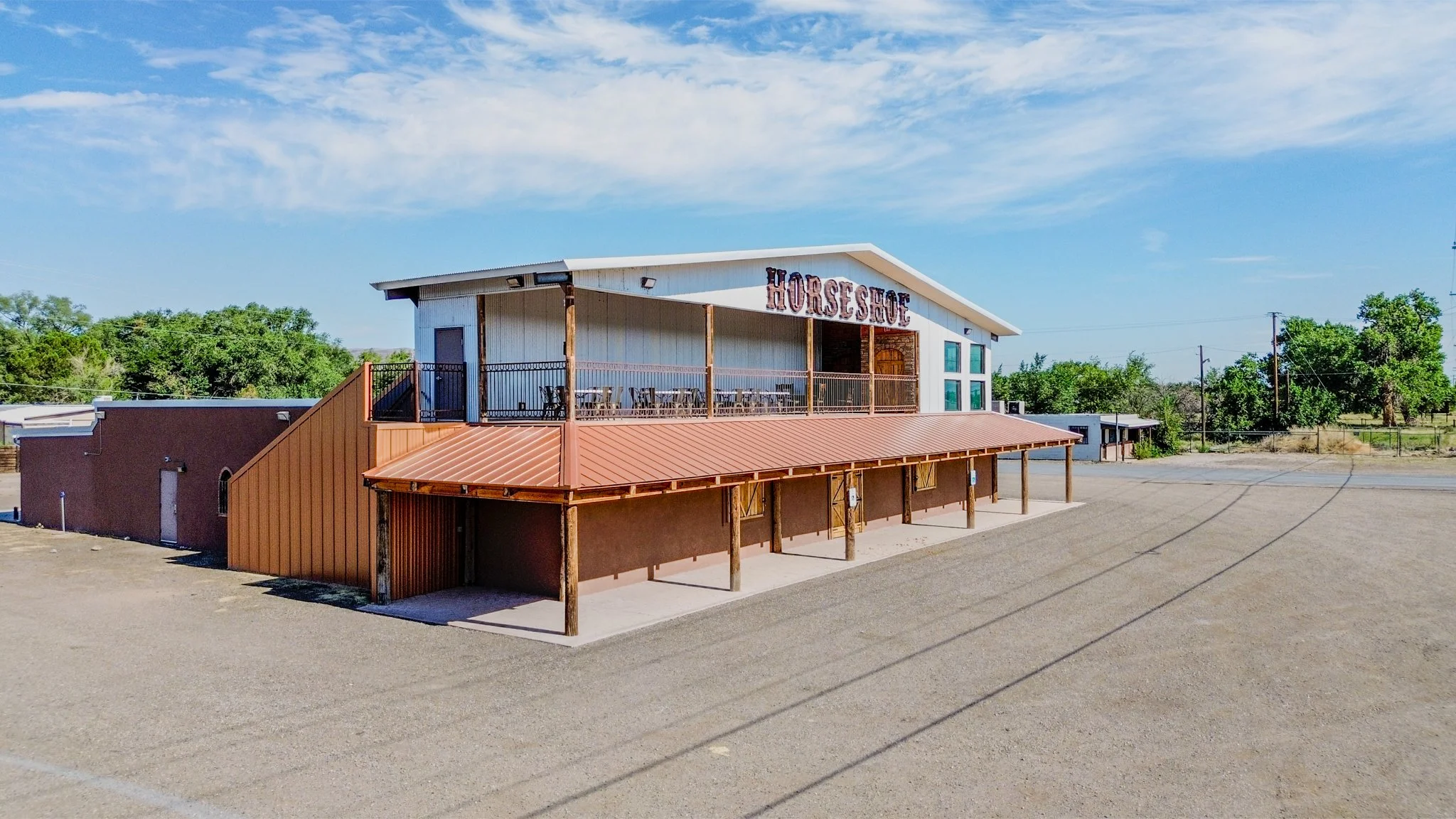 The image shows the Horseshoe in Los Lunas from the right front side, highlighting the curve of the structure as it extends outward. This perspective reveals both the front face and the depth of the building, with the surrounding landscape and sky completing the scene.